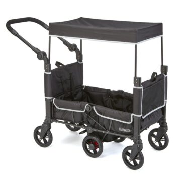 The best stroller wagon for two that goes everywhere easily! Load up 2 little ones and easily push and pull around the neighborhood thanks to the easy glide, smooth turning wheels that pivot on a dime. Plus with just a 17” fold, this is the ultimate kids wagon stroller for road trips and plane rides.