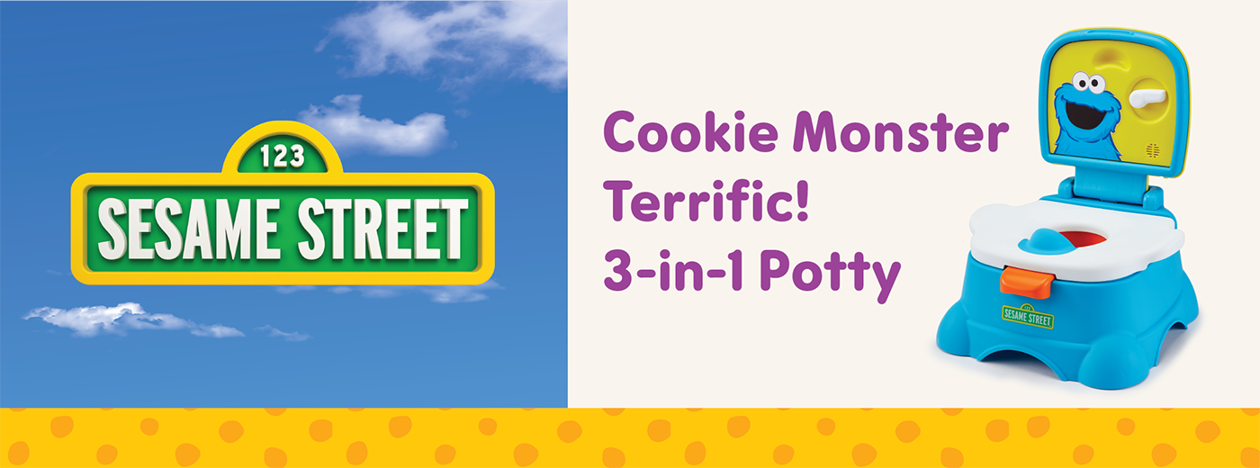 The Cookie Monster Terrific! 3-in-1 Potty helps big kids tackle their toilet training adventure while having fun! The potty includes a pretend flush handle with fun sounds and Cookie Monster’s encouraging voice to make potty time enjoyable. And with the toilet trainer and step stool, the Cookie Monster 3-in-1 Potty helps make your child’s transition to an adult toilet even easier.